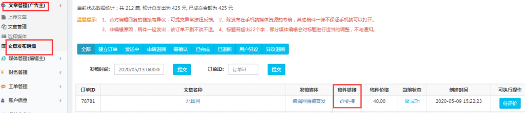 第五步【文章发布明细】等待媒体发出【回链】